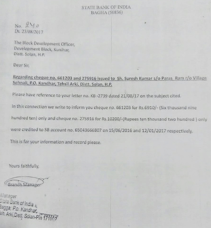 बीडीओ कुनिहार ने इस बावत सुरेश कुमार के खाते में चेक जमा होने बावत एसबीआई बागा की शाखा की ओर से जारी प्रमाणपत्र का हवाला भी दिया हैं। इस प्रमाण पत्र में लिखा हैं कि 6910 रूपए का चेक नंबर 661203 और 10हजार 200 रुपए का चेक नंबर 275916 स्टेट बैंक ऑफ पटियाला (अब एसबीआई) में सुरेश कुमार के ही खाते में 16 जून 2016और 12 जनवरी 2017 को जमा हुए हैं।
