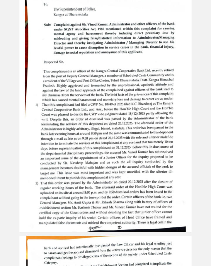 भारदवाज ने एसपी कांगड़ा को लिखा कि प्रशासक ने उनको हाईकोर्ट का आदेश आने के बाद नौकरी से 20 दिसंबर 2025 को बर्खास्त कर दिया व रात दस बजे के ये आदेश किए। वो दोबार हाईकोर्ट गए व बर्खास्तगी के इस आदेश पर अदालत ने स्टे लगा दिया और 31 दिसंबर को बतौर डीजीएम सेवानिवृत हो गए।लेकिन बैंक ने उन्हें सेवानिवृति बाद देय लाभों का भुगतान नहीं किया। ये सब उन्हें उत्पीड़न करने की नियत से किया जा रहा है।