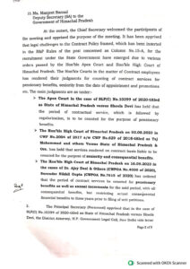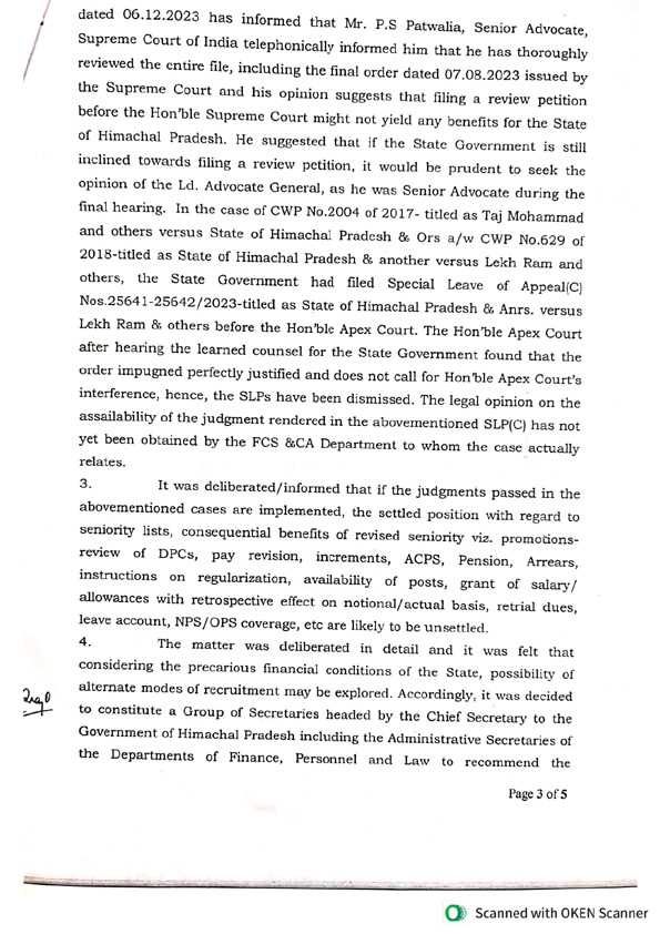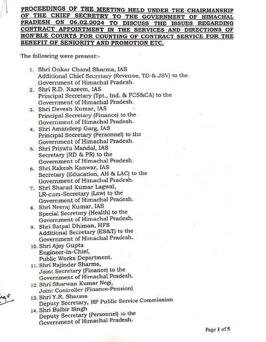नौकरशाहों की इस महत्वपूर्ण बैठक में ताज मोहम्मद बनाम हिामचल सरकार और डाक्टर अजय देयोल बनाम हिमाचल सरकार जैसे मामले पर भी चर्चा हुई । इन मामलों में हाईकोर्ट से लेकर सुप्रीम कोर्ट तक ने इन कर्मचारियों की कांट्रेक्ट अवधि की सेवाएं सालाना वेतन बढोतरी और पेंशन लाभों के लिए गिनने के आदेश दिए हैं।