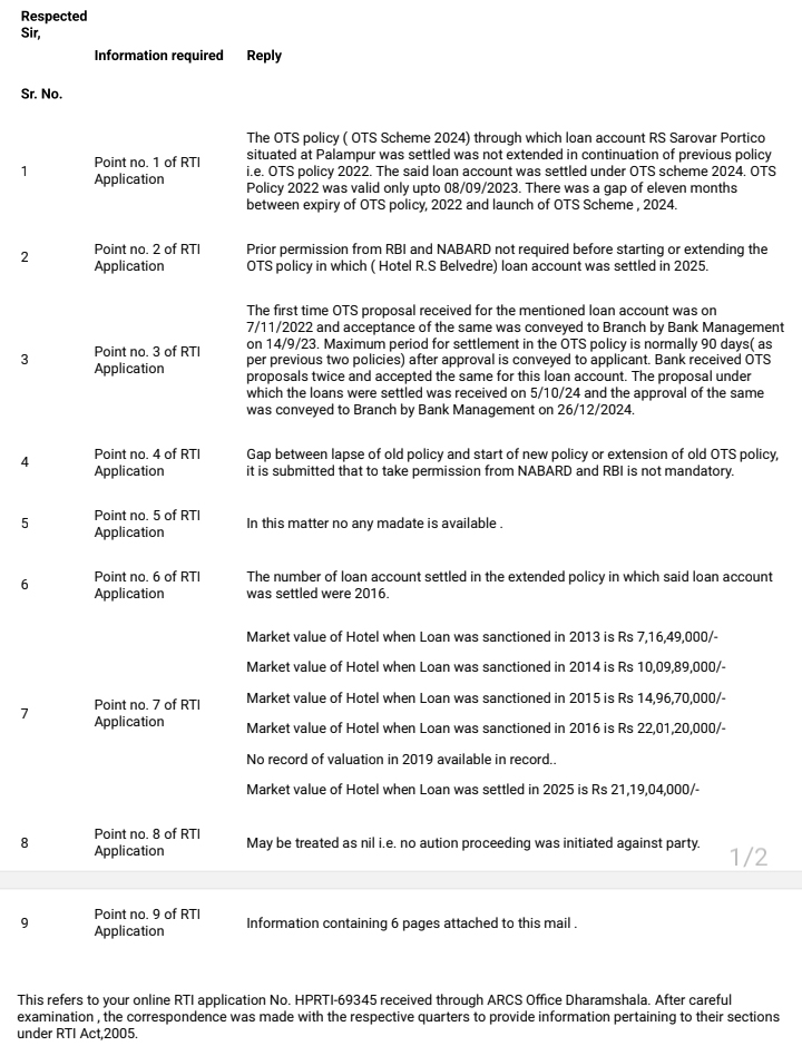 इसके बाद 2019 में इस होटल की वैल्यू कितनी थी बैंक ने कहा कि इसके कोई दस्तावेज उपलब्ध नहीं है।ओटीएस के तहत 2025 में इस कर्ज को सेटल कर लिया गया व आश्चर्यजनक तरीके से इस होटल की मार्किट वैल्यू घट कर 21करोड़ 19 लाख 4 हजार रुपए रह गई।जबकि ये सालाना बढ़ती रहनी चाहिए थी।