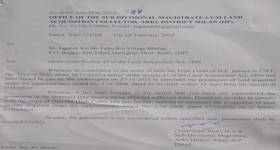 गांव भलग व समत्याड़ी के डेढ दर्जन के करीब लोगों को अपनी जमीनें व घरबार खाली कराने के लिए एसडीएम अर्की से नोटिस जारी हो गए हैं। नोटिस में साफ कहा गया है कि हाईकोर्ट के आदेश हैं ऐसे मे वो 27 फरवरी तक अपनी जमीनों व घर बार का कब्जा खुद छोड़ दें अन्यथा प्रशासन जबरन कब्जा ले लेगा।